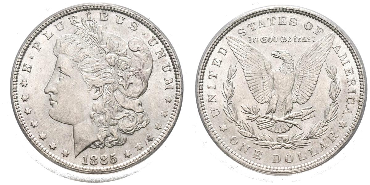 ESTADOS UNIDOS. 1 Dollar (Ar. 26,73g/38mm)*. 1885. Philadelphia. VAM-1. (Km#110). Encapsulado por ANACS MS63. *Peso y medida teórico.