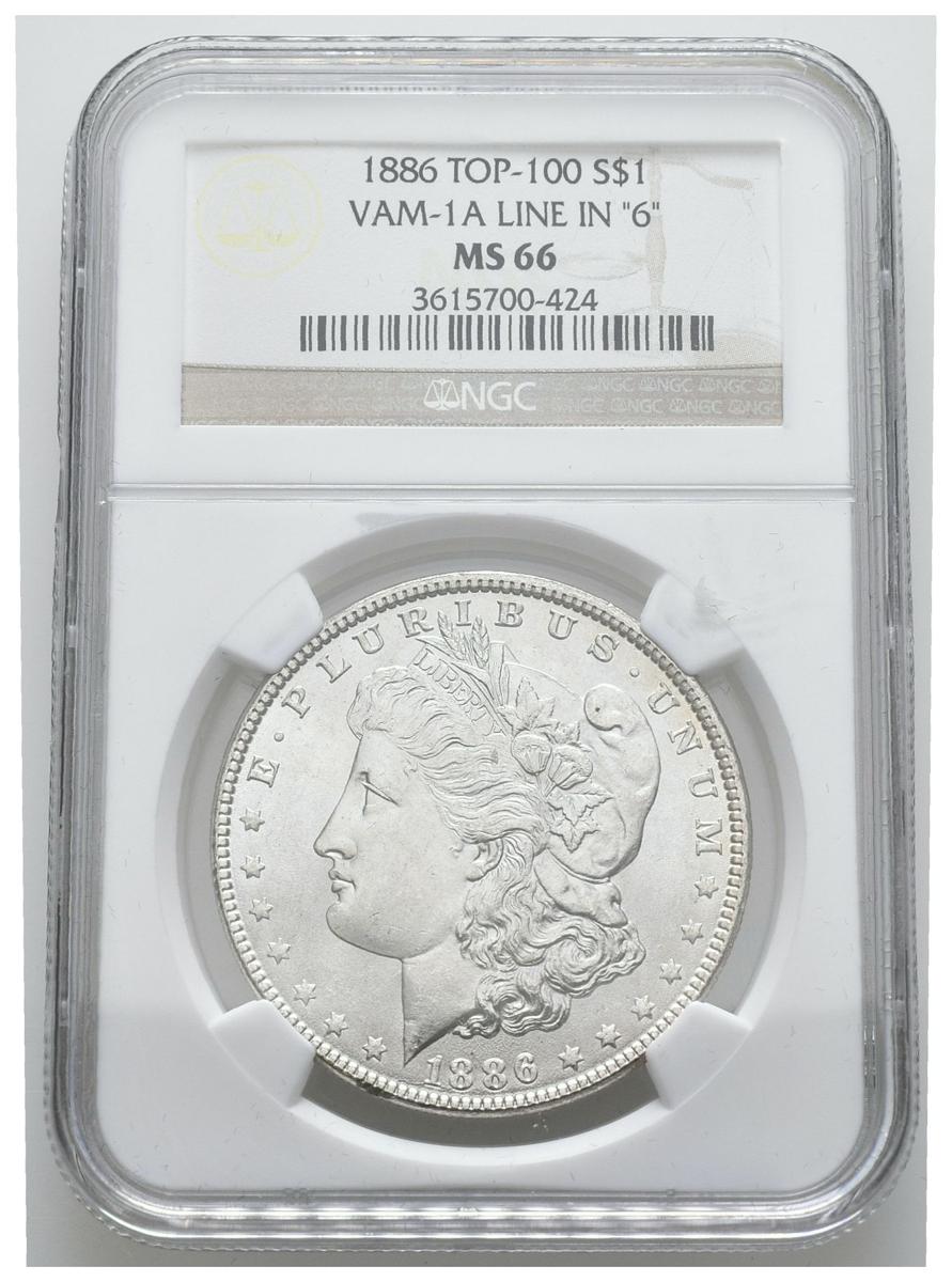 ESTADOS UNIDOS. 1 Dollar (Ar. 26,73g/38mm)*. 1886. Philadelphia. VAM-1 A Line in "6". TOP 100. (Km#110). Encapsulado por NGC MS66. *Peso y medida teórico.