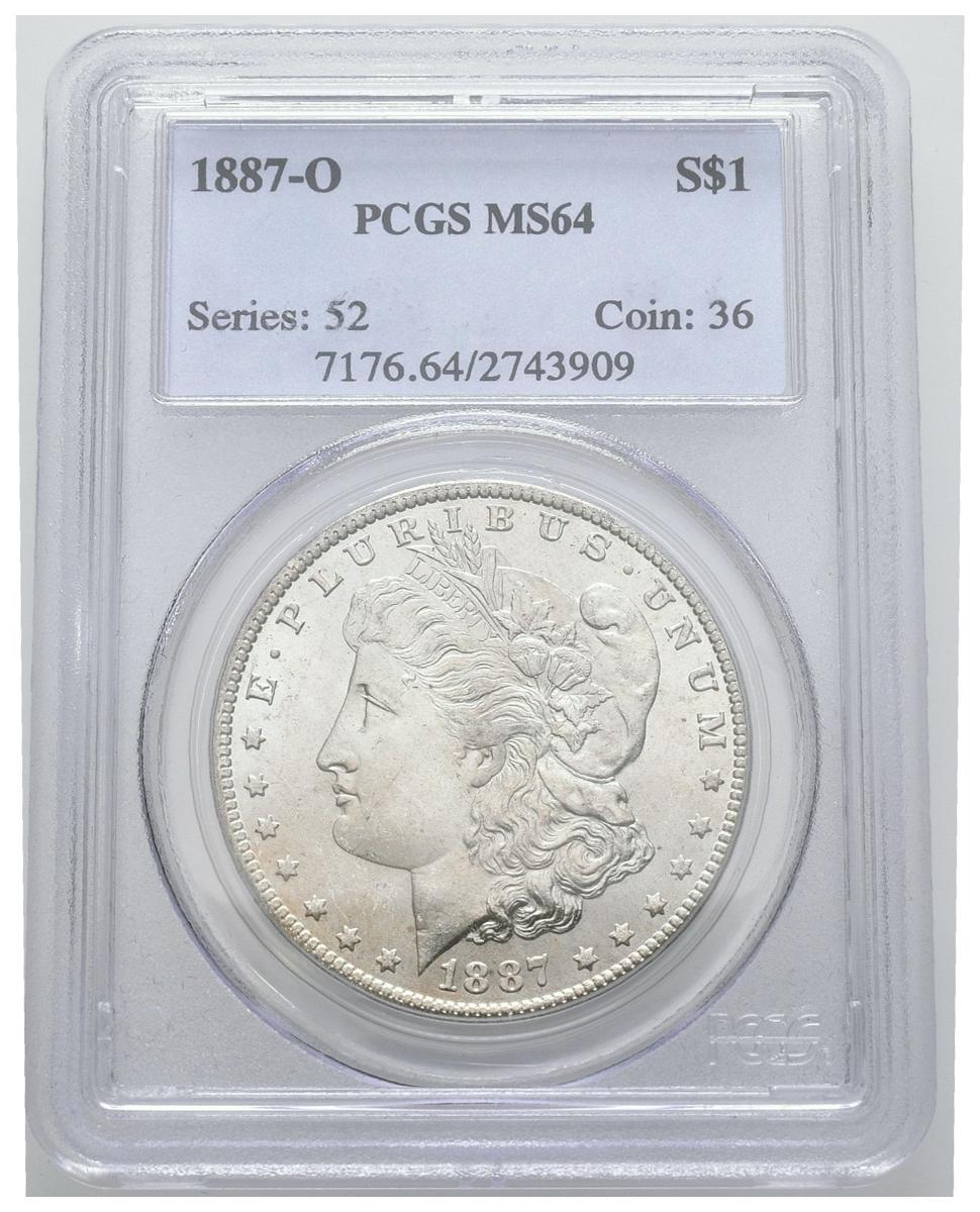 ESTADOS UNIDOS. 1 Dollar (Ar. 26,73g/38mm)*. 1887. Nueva Orleans O. (Km#110). Encapsulado por PCGS MS64. *Peso y medida teórico.