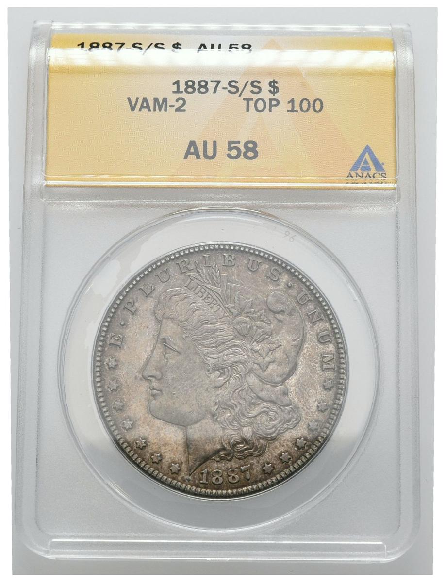 ESTADOS UNIDOS. 1 Dollar (Ar. 26,73g/38mm)*. 1887. San Francisco S-S. VAM-2. TOP 100. (Km#110). Encapsulado por ANACS AU58. *Peso y medida teórico.