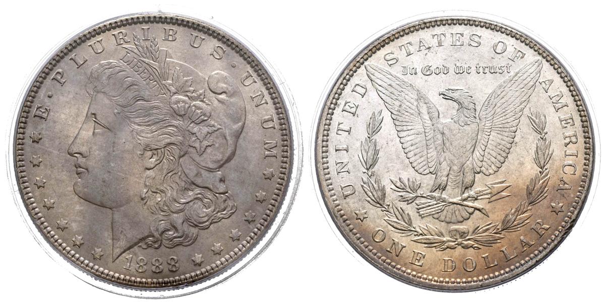 ESTADOS UNIDOS. 1 Dollar (Ar. 26,73g/38mm)*. 1888. Philadelphia. (Km#110). Encapsulado por PCGS MS65. *Peso y medida teórico.