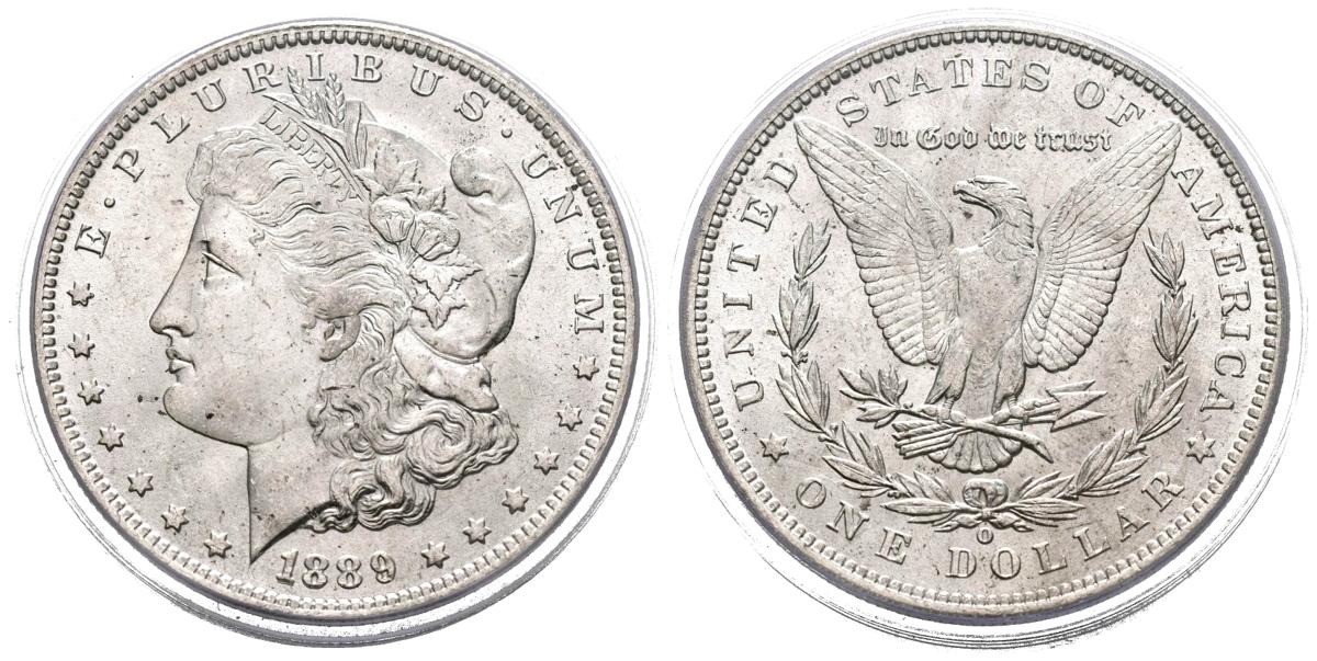 ESTADOS UNIDOS. 1 Dollar (Ar. 26,73g/38mm)*. 1889. Nueva Orleans O. (Km#110). Encapsulado por PCGS MS63. *Peso y medida teórico.