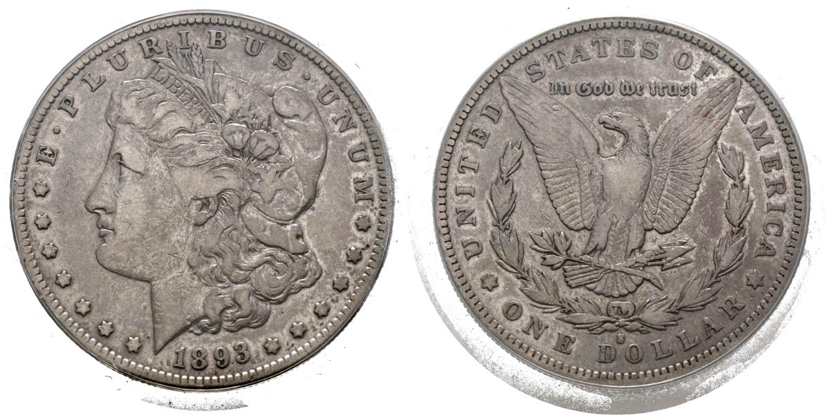 ESTADOS UNIDOS. 1 Dollar (Ar. 26,73g/38mm)*. 1893. San Francisco S. (Km#110). Limpiada. Encapsulado por ANACS VF25 Details. *Peso y medida teórico.