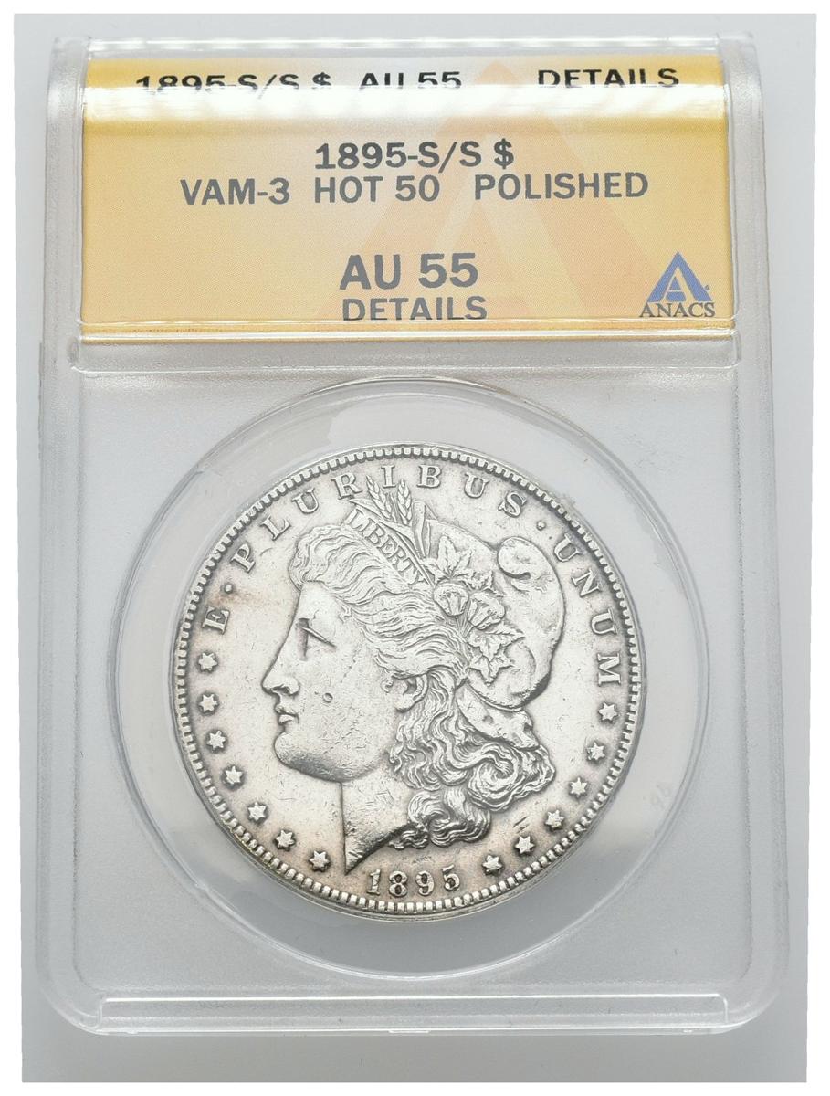 ESTADOS UNIDOS. 1 Dollar (Ar. 26,73g/38mm)*. 1895. San Francisco S-S. VAM-3. HOT-50. (Km#110). Pulida. Encapsulado por ANACS AU55 Details. *Peso y medida teórico.