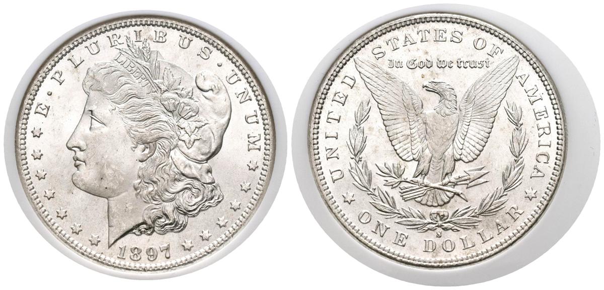 ESTADOS UNIDOS. 1 Dollar (Ar. 26,73g/38mm)*. 1897. San Francisco S. (Km#110). Encapsulado por NGC MS64. *Peso y medida teórico.