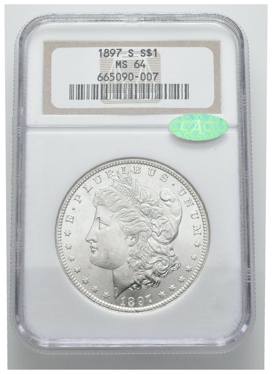 ESTADOS UNIDOS. 1 Dollar (Ar. 26,73g/38mm)*. 1897. San Francisco S. (Km#110). Encapsulado por NGC MS64. *Peso y medida teórico.