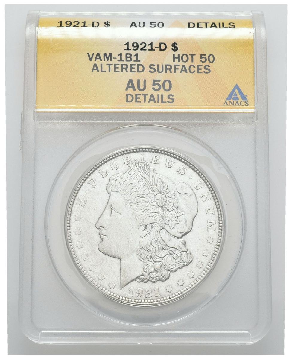 ESTADOS UNIDOS. 1 Dollar (Ar. 26,73g/38mm)*. 1921. Denver D. VAM 1B1. HOT-50. (Km#110). Rayas. Encapsulado por ANACS AU50 Details. *Peso y medida teórico.