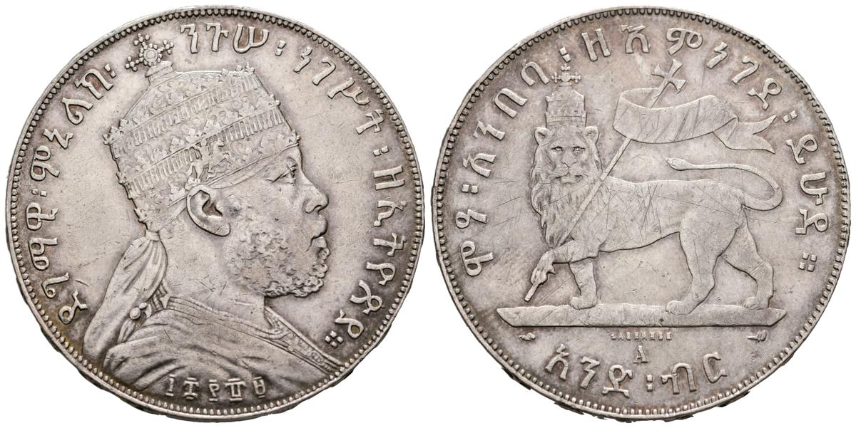 ETIOPÍA. 1 Birr (Ar. 28,01g/40mm). 1896 (1889-EE). París A. (Km#5). MBC. Escasa.