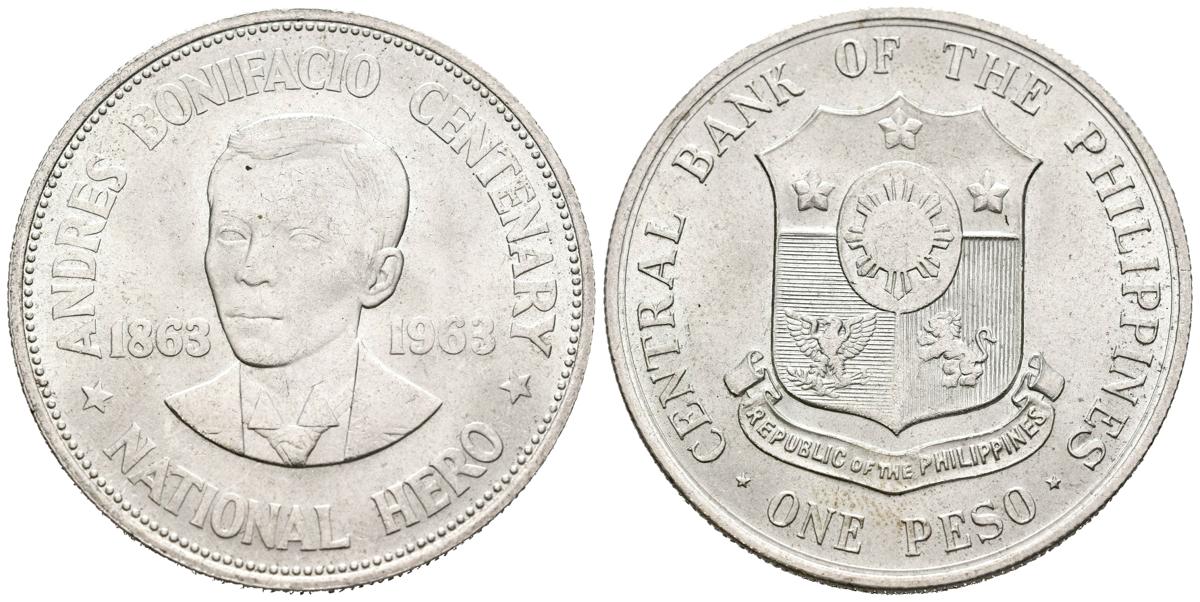 FILIPINAS. 1 Peso (Ar. 26,71g/38mm). 1963. Centenario de Andrés Bonifacio. (Km#193). EBC+.
