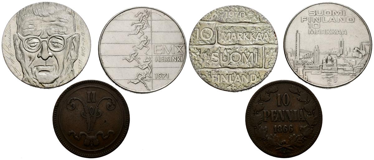 FINLANDIA. Bonito conjunto de 3 monedas, 2 de ellas en plata (10 Markkaa) y 1 en bronce (10 Pennia), acuñadas en 1866, 1970 y 1971. Diferente estados de conservación. A EXAMINAR.