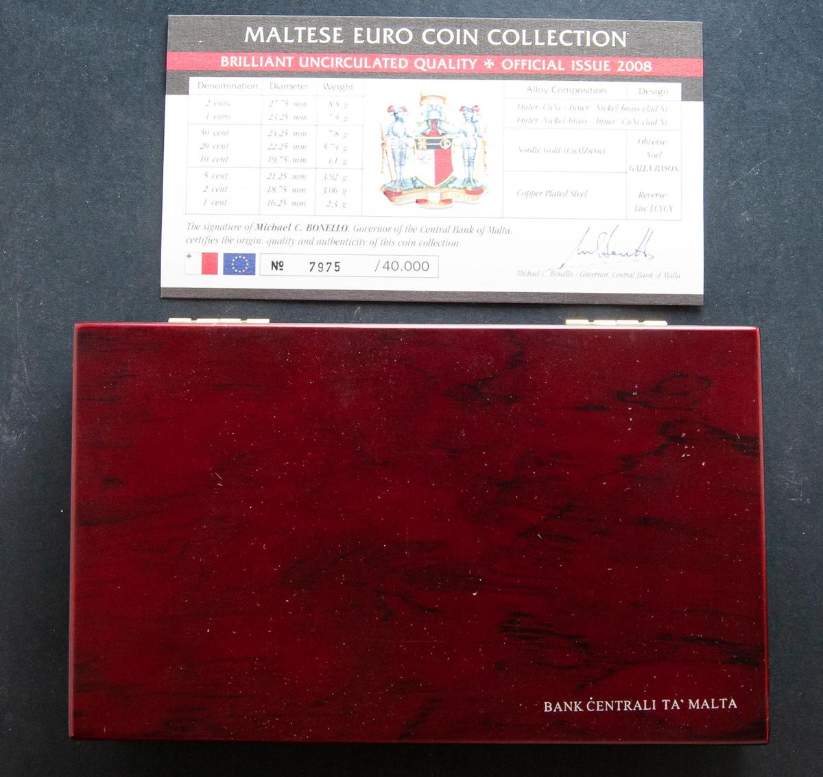 MALTA. Set completo de la tirada del Euro de 2008 (valores comprendidos entre 1 céntimo y 2 Euros). Banco Central de Malta. SC. Incluye estuche originale en madera y certificado de autenticidad.