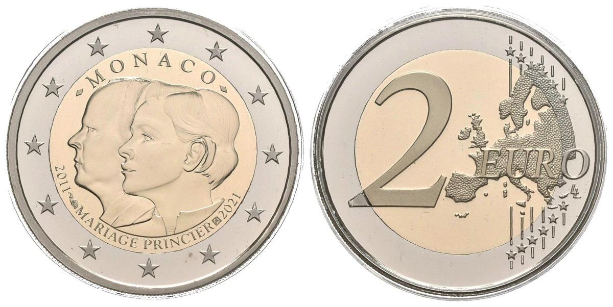 MONACO. 2 Euros (Cu-Ni. 8,50g/26mm). 2021. 10 Aniversario de boda de los Príncipes. Calidad: Belle Épreuve (PROOF). Tirada de sólo 15.000 unidades. Incluye estuche y certificado de autenticidad.