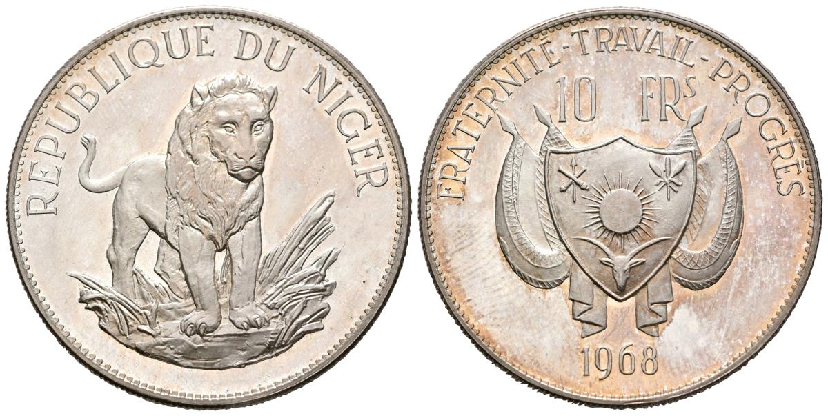 NIGER. 100 Francos (Ar. 19,98g/38mm). 1968. León. (Km#8.1). PROOF. Ligeras rayitas. Escasa. Sólo 1000 unidades acuñadas.