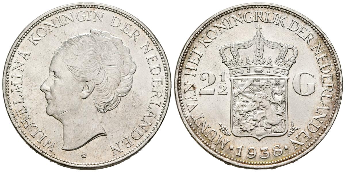 PAÍSES BAJOS. 2 1/2 Gulden (Ar. 24,99g/38mm). 1938. Wilhelmina. (Km#165) EBC-/EBC. Ligeras marquitas.