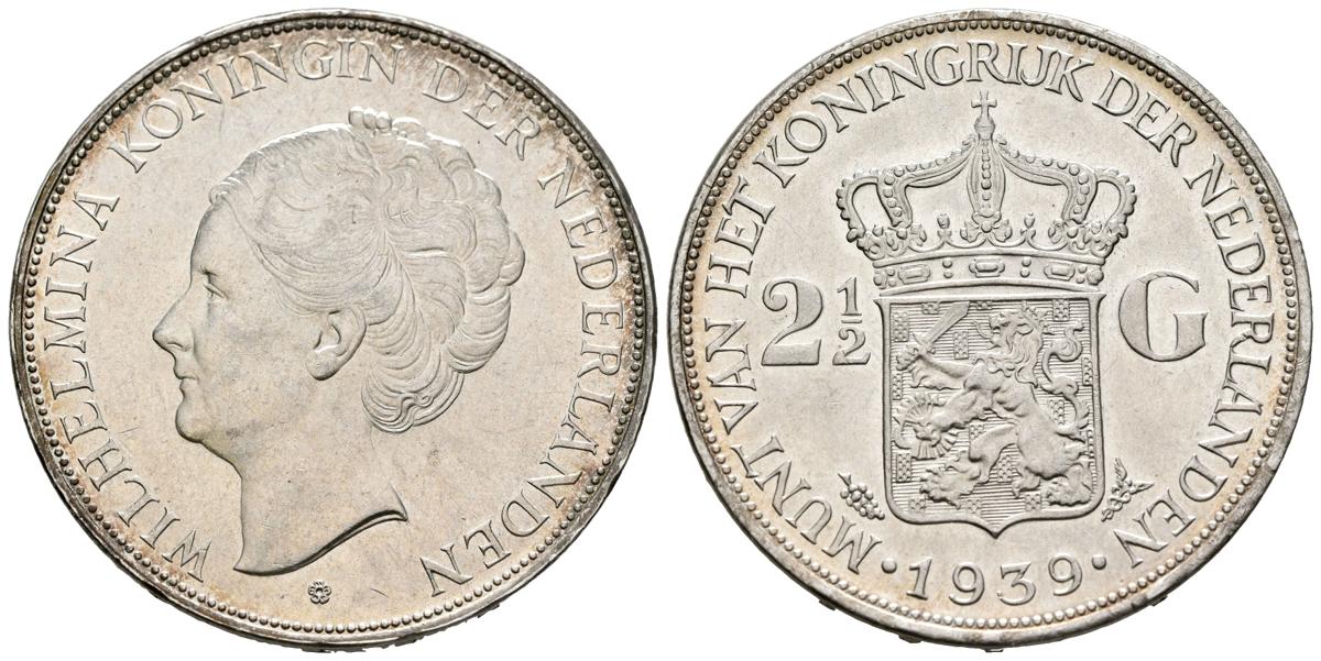 PAÍSES BAJOS. 2 1/2 Gulden (Ar. 25,01g/38mm). 1939. Wilhelmina. (Km#165) EBC-. Ligeras marquitas.
