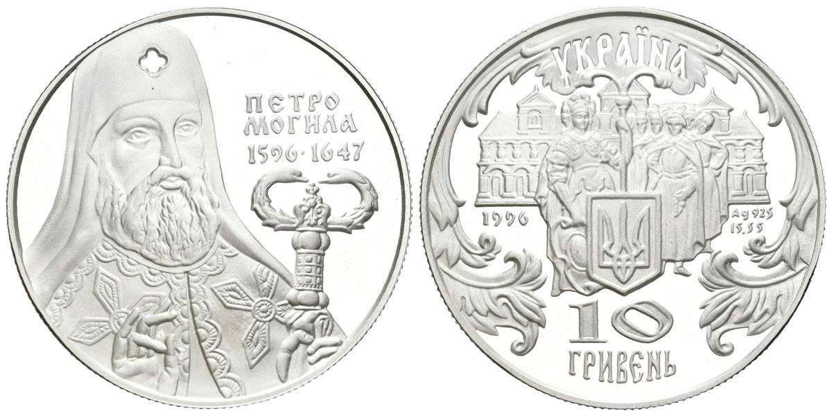 UCRANIA. 10 Hryven (Ar.16,93g/33mm). 1996. Petro Mohyla, 1596-1647. (Km#34). PROOF. Muy rara. Acuñación de 5000 ejemplares. Excelente ejemplar.