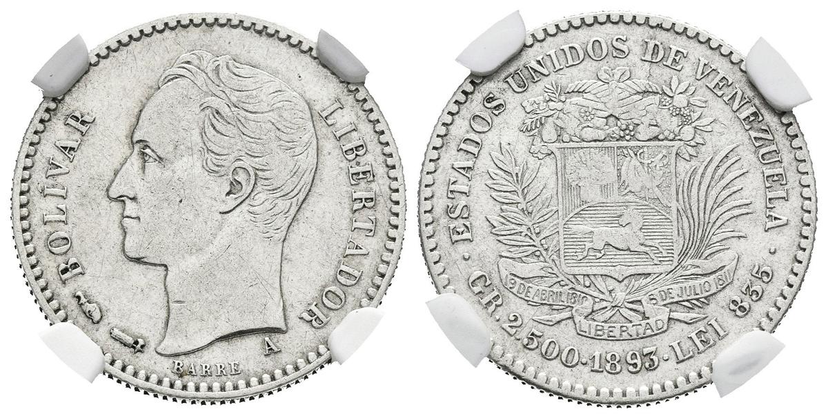 ESTADOS UNIDOS DE VENEZUELA . 1/2 Bolívar. (Ar. 2,50g/18mm). 1893. París A. (Km#Y21). Encapsulado NGC XF-45.