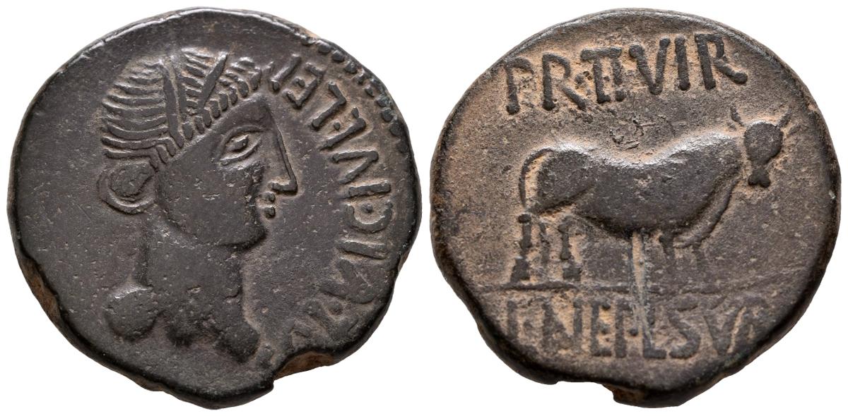 CELSE (Velilla del Ebro, Zaragoza). As. (Ae. 17,31g/30mm). 50-30 a.C. (FAB-796). Anv: Busto femenino a derecha con palma, delante leyenda: COL VIC IVL LEP. Rev: Yunta a derecha, encima leyenda: PR QVIN, debajo leyenda: M FVL C OTAC. MBC.