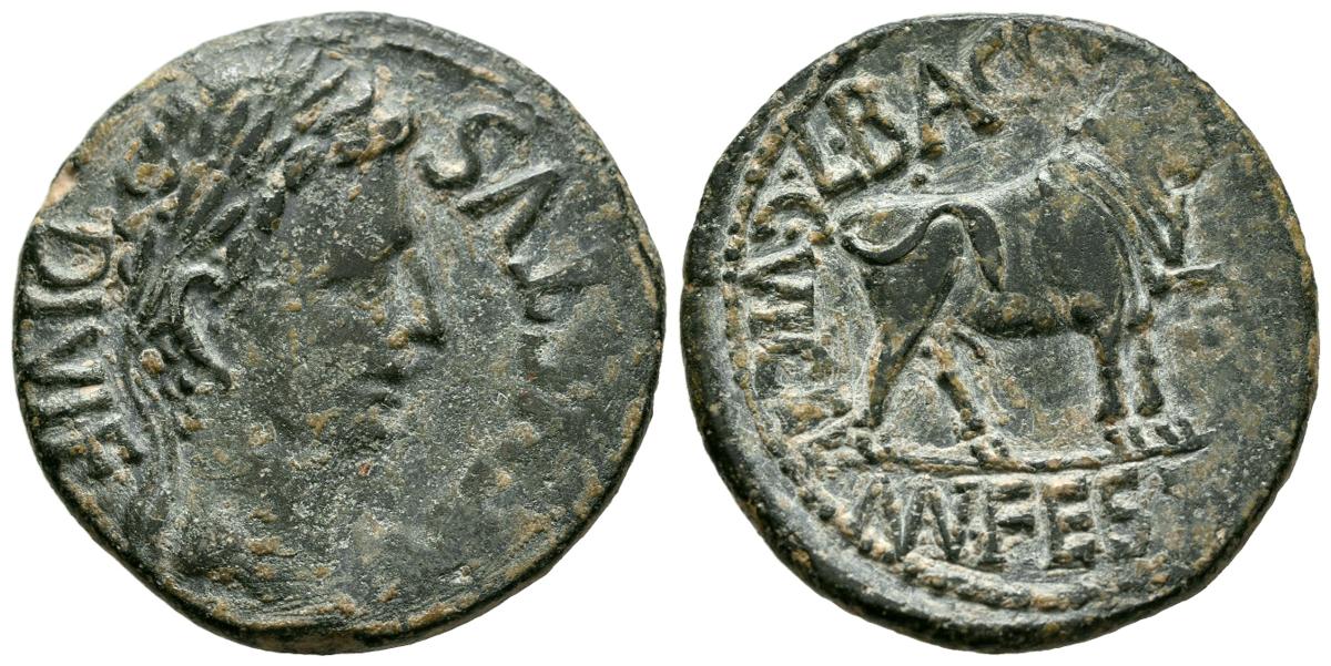 CELSE (Velilla de Ebro, Zaragoza). As (Ae. 10,78g/29mm). 27 a.C-14 d.C. (FAB-809). Anv: Cabeza laureada de Augusto a derecha, alrededor leyenda: AVGVSTVS DIVI F. Rev: Toro a derecha, alrededor leyenda: L BACCIO MN FESTO C VI CEL II VIR. MBC/MBC+.