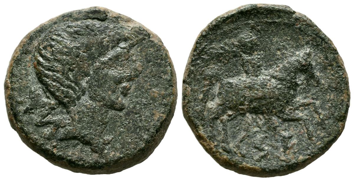 CESE (Tarragona). As. (Ae. 9,27g/23mm). 120-20 a.C. (FAB-2294). Anv: Cabeza masculina a derecha, detrás letras ibéricas: Ti y Gi. Rev: Jinete con palma a derecha, debajo leyenda ibérica: CeSE. MBC.