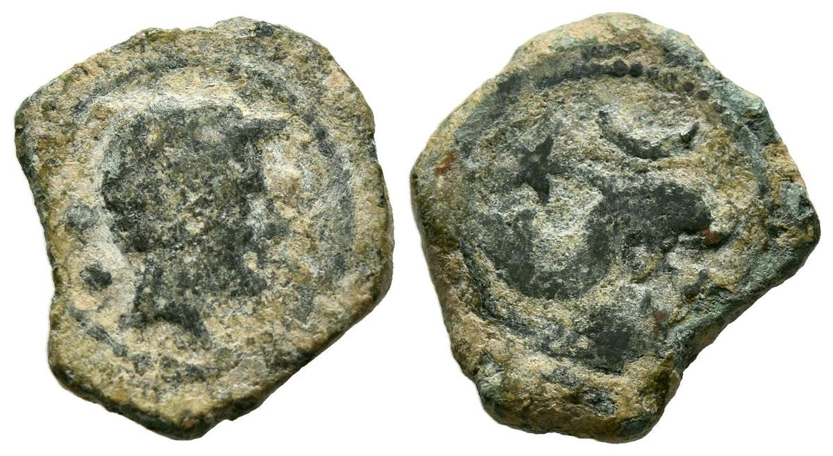 CESSE (Tarragona). Sextante. (Ae. 2,25g/16mm). 120-20 a.C. (FAB-2344). Anv: Cabeza maculina a derecha, detrás dos puntos. Rev: Delfín a derecha, encima estrella y creciente. MBC-.