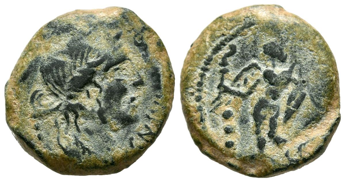 COLONIA PATRICIA (Córdoba). Semis. (Ae. 7,12g/20m). 50 a.C. (FAB-1984). Anv: Cabeza de Venus a derecha, detrás tres puntos, delante leyenda: CN IVLI L F Q. Rev: Cupido con cornucopia y antorcha a izquierda, delante tres puntos, detrás leyenda: CORDVBA. MBC-.