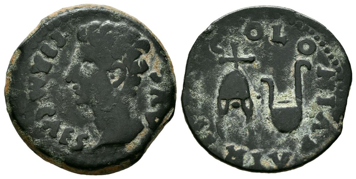 COLONIA PATRICIA (Córdoba). Semis. (Ae. 4,67g/22mm). 27 a.C.-14 d.C. (FAB-1992). Anv: Cabeza de Augusto a izquierda, alrededor leyenda: PERM CAES AVG. Rev: Gorro flamíneo y símpulo, alrededor leyenda: COLONIA PATRICIA. MBC-.