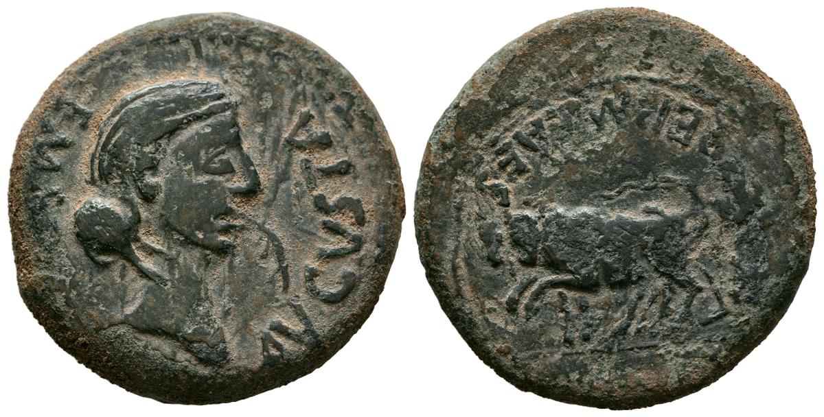 EMERITA AUGUSTA (Mérida, Badajoz). As. (Ae. 16,73g/28mm). 22 a.C.-14 d.C. (FAB-1007). Anv: Cabeza femenina a derecha, alrededor leyenda: EMERITA AVGVSTA. Rev: Yunta a izquierda, alrededor leyenda: PERM CAES AVG. MBC/MBC-. Escaso ejemplar.