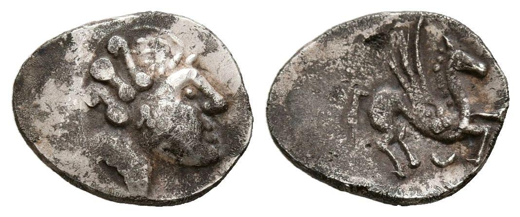 EMPORION (Ampurias, Gerona). Tritartemorion. (Ar. 0,56g/11mm). 220-215 a.C. (FAB-1105). Anv: Cabeza femenina a derecha. Rev: Pegaso volando a derecha. MBC.