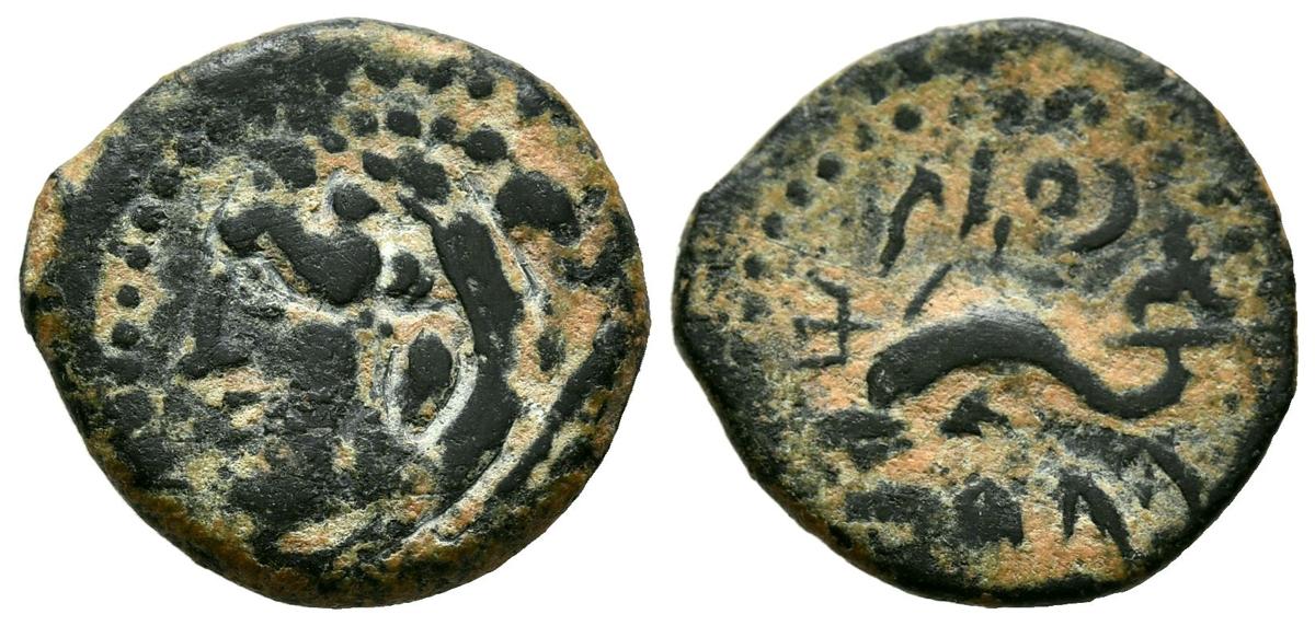 GADES (Cádiz). Cuadrante (Ae. 2,54g/17mm). 100-20 a.C. (FAB-1356). Anv: cabeza de Hércules a izquierda detrás clava; Rev: delfín a izquierda, detrás tridente y leyenda púnica. MBC.