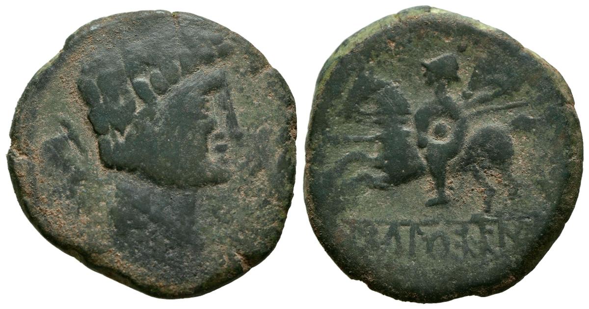 ICALCUNSCEN (Iniesta, Cuenca). As. (Ae. 12,27g/31mm). 120-20 a.C. (FAB-1412). Anv: Cabeza masculina a derecha, detrás delfín y delante estrella. Rev: Jinete con lanza y escudo, en exergo leyenda ibérica: ICaLCuNSCeN. MBC-.