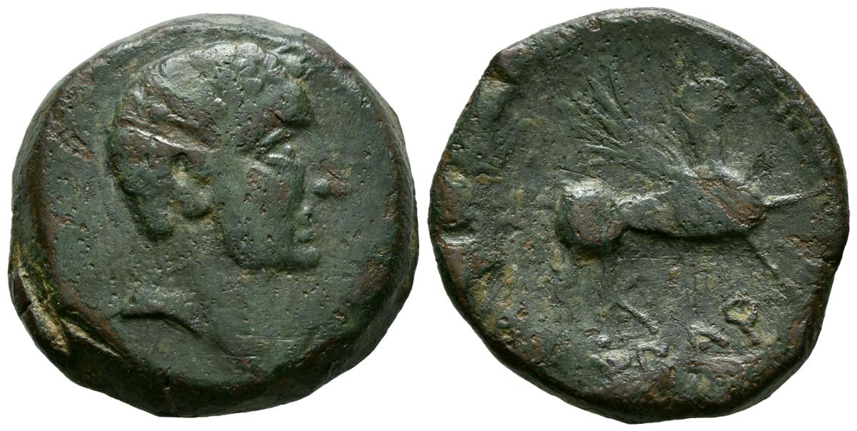 ILIBERRI (Granada). As. (Ae. 19,93g/28mm). 150-20 a.C. (FAB-1496). Anv: Cabeza masculina a derecha. Rev: Esfinge a derecha, alrededor leyenda ibérica: ILDuRIRCeSTIN. MBC/MBC-.