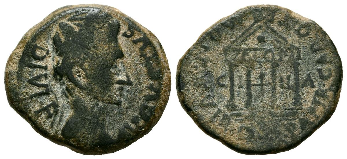 ILICI (Elche, Alicante). Semis. (Ae. 5,57g/21mm). 27 a.C.-14 d.C. (FAB-1519). Anv: Cabeza laureada de Augusto a derecha, alrededor leyenda: AVGVSTVS. DIVI. F. Rev: Templo tetrástilo, en el arquitrave: IVNONI, entre las columnas: C.I.I.A., alrededor: Q. PAPIR. CAR. Q. TERE. MONT. II. VIR. Q. MBC.