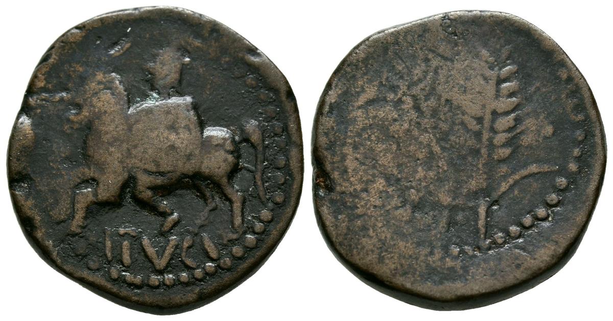 ITUCI (Tejada la Vieja, Sevilla). As. (Ae. 11,57g/26mm). 150-50 a.C. (FAB-1602). Anv: Jinete con rodela a izquierda, debajo leyenda: ITVCI. Rev: Dos espigas. MBC. Raro.