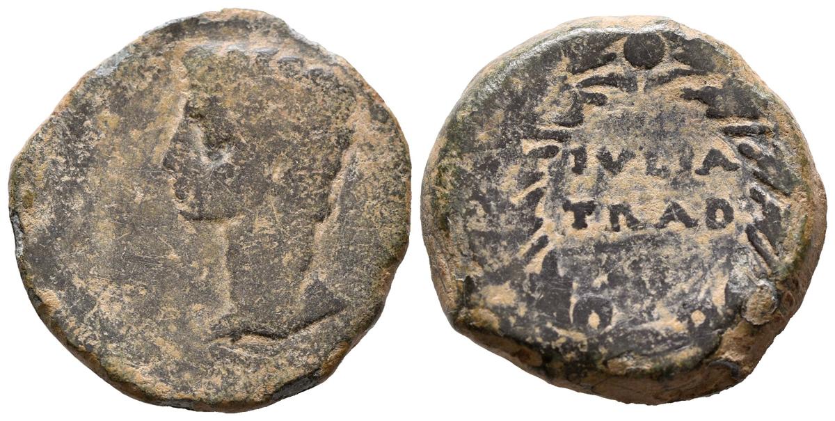 IULIA TRADUCTA (Algeciras, Cádiz). As. (Ae. 10,46g/25mm). 27 a.C.-14 d.C. (FAB-1614). Anv: Cabeza de Augusto a izquierda, alrededor leyenda: PERM CAES AVG. Rev: Leyenda: IVLIA/TRAD, dentro de corona de laurel. MBC-.