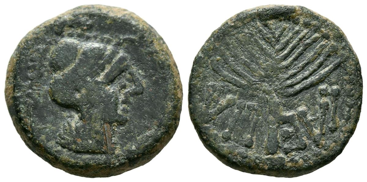 LAELIA (Olivares, Sevilla). Semis. (Ae. 6,95g/21mm). 50-20 a.C. (FAB-1651). Anv: Cabeza masculina con casco a derecha. Rev: Palma, debajo leyenda: LAELIA. MBC.