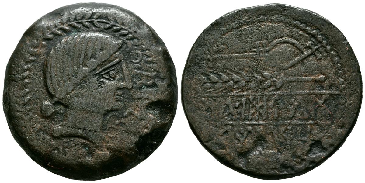 OBULCO (Porcuna, Jaén). Dupondio. (Ae. 25,66g/34mm). 220-20 a.C. (FAB-1779). Anv: Cabeza femenina diademada a derecha, delante leyenda: OBVLCO. Rev: Arado a derecha y espiga a izquierda, debajo leyenda ibérica: SIUBoLAI/ORCaIL. MBC-.