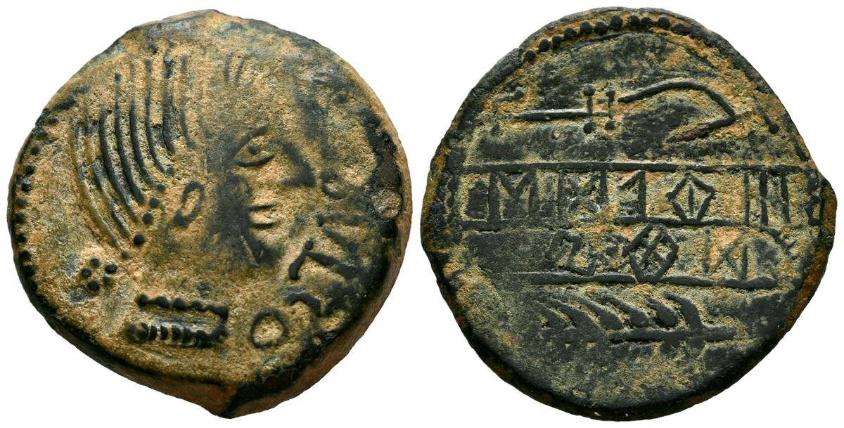 OBULCO (Porcuna, Jaén). As. (Ae. 15,77g/29mm). 220-20 a.C. (FAB-1795). Anv: Cabeza diademada femenina a derecha, delante leyenda: OBVLCO. Rev: Leyenda ibérica: ToBoTuCi/BuTeLCoS. MBC.
