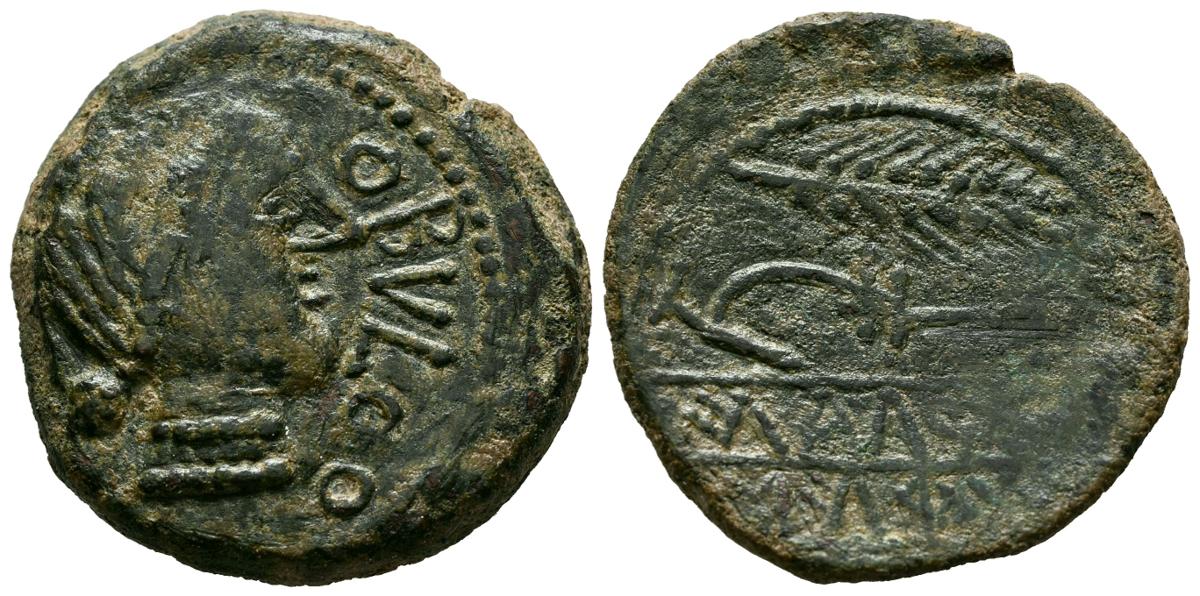 OBULCO (Porcuna, Jaén). As. (Ae. 14,58g/29mm). 220-20 a.C. (FAB-1803). Anv: Cabeza femenina a derecha, delante leyenda: OBVLCO. Rev: Espiga a derecha, debajo arado a izquierda, debajo leyenda ibérica entre líneas: SICaAI/ETaCuIS. MBC+.