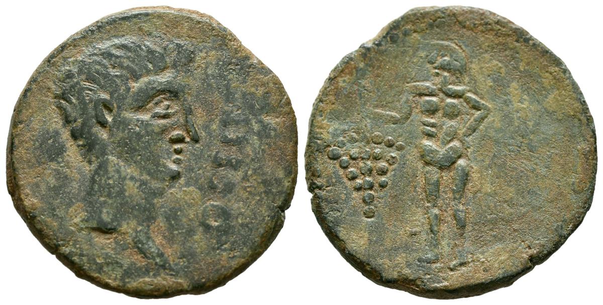 OSET (San Juan de Aznalfarache, Sevilla). As. (Ae. 8,25g/26mm). 120-20 a.C. (FAB-1949). Anv: Cabeza masculina a derecha, delante leyenda: OSSET. Rev: Genio estante a izquierda con racimo de uvas. MBC+.
