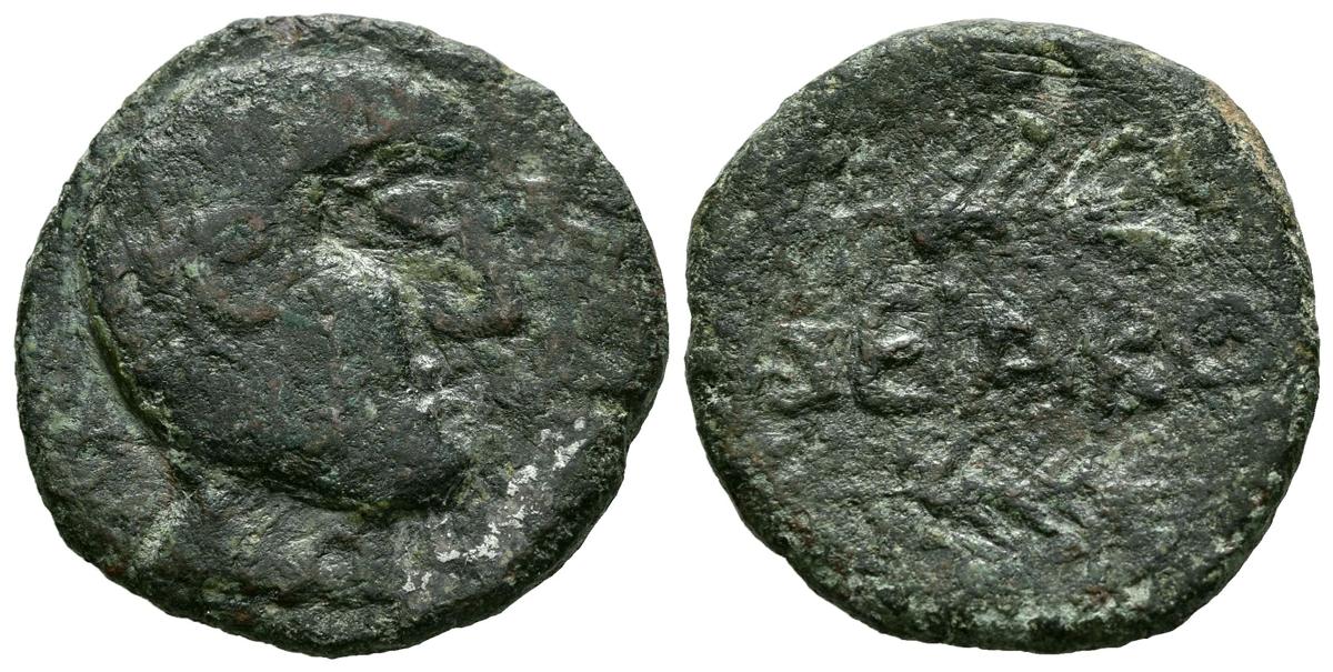 SEARO (Utrera, Sevilla). As. (Ae. 7,24g/24mm). 120-50 a.C. (FAB-2113). Anv: Cabeza masculina a derecha, delante S. Rev: Leyenda: SEARO, entre dos espigas a derecha. MBC-.