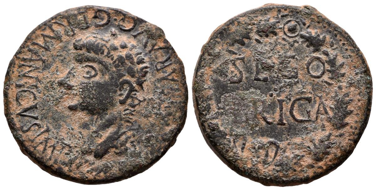 SEGOBRIGA (Saelices, Cuenca). As. (Ae. 11,08g/29mm). 37-41 d.C. (FAB-2191). Anv: Cabeza laureada de Calígula a izquierda, alrededor leyenda: C CAESAR AVG GERMANICVS IMP. Rev: Leyenda en dos líneas: SEGO/BRIGA, dentro de láurea. MBC-.