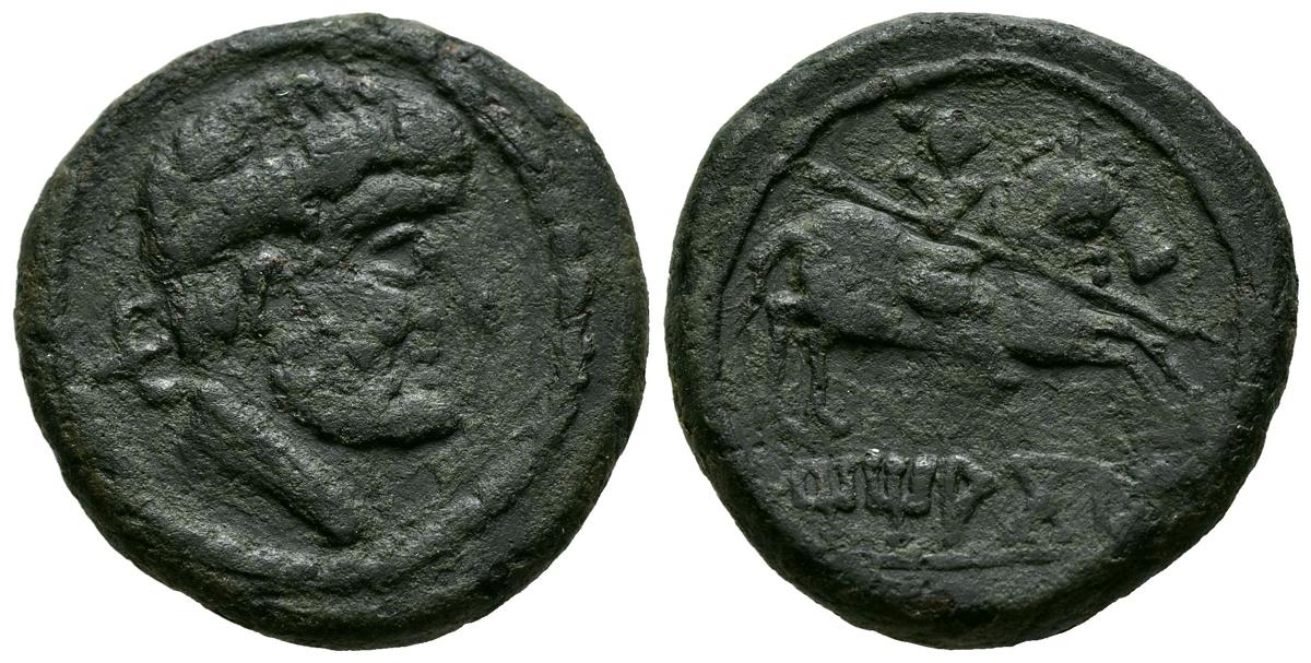 TITIACOS (Tricio, La Rioja). Semis. (Ae. 9,97g/24mm). 120-20 a.C. (FAB-2395). Anv: Cabeza masculina con barba a derecha, detrás letra ibérica: Ti. Rev: Jinete con lanza a derecha, debajo leyenda: TiTiACoS. MBC-.