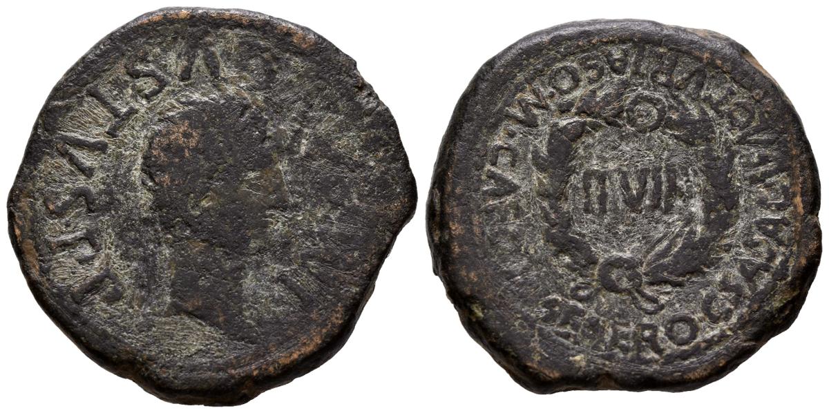 TURIASO (Tarazona). As. (Ae. 14,22g/30mm). 27 a.C.-14 d.C. (FAB-2438). Anv: Cabeza de Augusto a derecha, alrededor leyenda: IMP AVGVSTVS P P. Rev: II VIR, dentro de corona de laurel, alrededor leyenda: M CAECIL SEVERO C VAL AQVILO TVRIASO. BC.