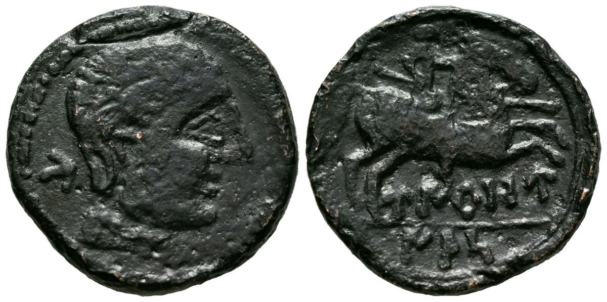 UIROUIAS (Borobia, Soria). As. (Ae. 10,92g/26mm). 120-20 a.C. (FAB-2483). Anv: Cabeza masculina a derecha, detrás letras ibéricas: U. Rev: Jinete con lanza a derecha, debajo leyenda ibérica en dos partes con línea entre ellas: UIROU/IA. MBC-. Limpiado.