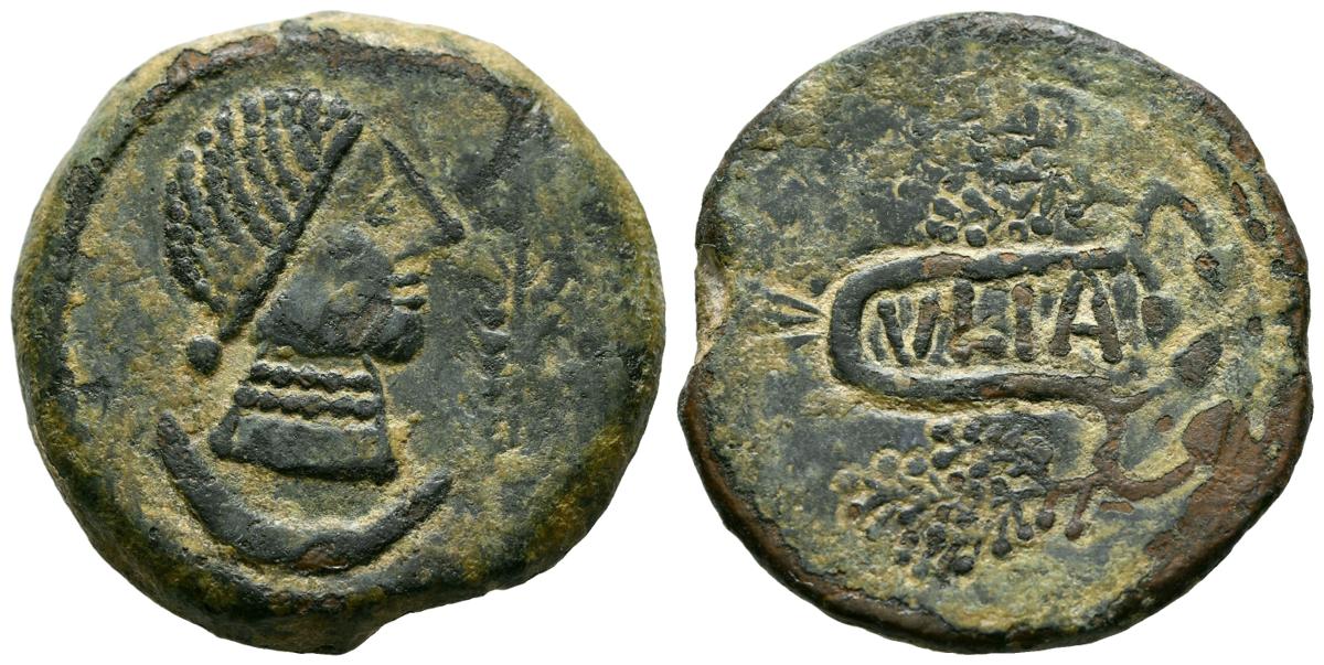 ULIA (Montemayor, Córdoba). As. (Ae. 17,36g/31mm). 50 a.C. (FAB-2494). Anv: Cabeza femenina a derecha, detrás letra ibérica Ta, delante palma. Rev: Leyenda: VLIA, dentro de ramas de vid. MBC.