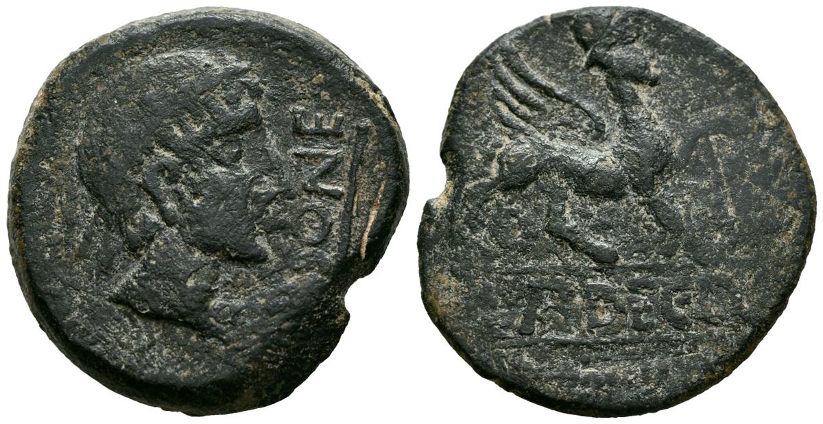 URSONE (Osuna, Sevilla). As. (Ae. 16,51g/31mm). 50 a.C. (FAB-2499). Anv: Cabeza masculina laureada a derecha, delante leyenda: VRSONE. Rev: Esfinge a derecha, debajo leyenda en cartela: L AP DEC Q F. MBC-.