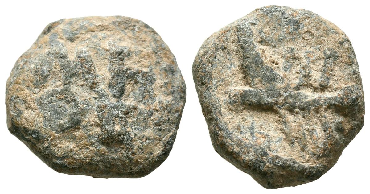INCIERTO. Plomo monetiforme. (Pb. 6,77g/18mm). Anv: Monograma. Rev: Palmera. MBC-.