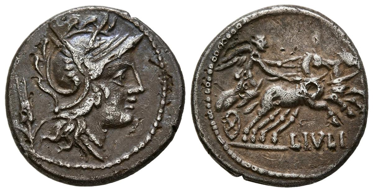 GENS JULIA. Denario. (Ar. 3,09g/19mm). 101 a.C. Roma. (Crawford 323/1; FFC 762). Anv: Cabeza de Roma a derecha, detrás espiga. Rev: Victoria conduciendo en biga a derecha, debajo leyenda: L IVLI. MBC.