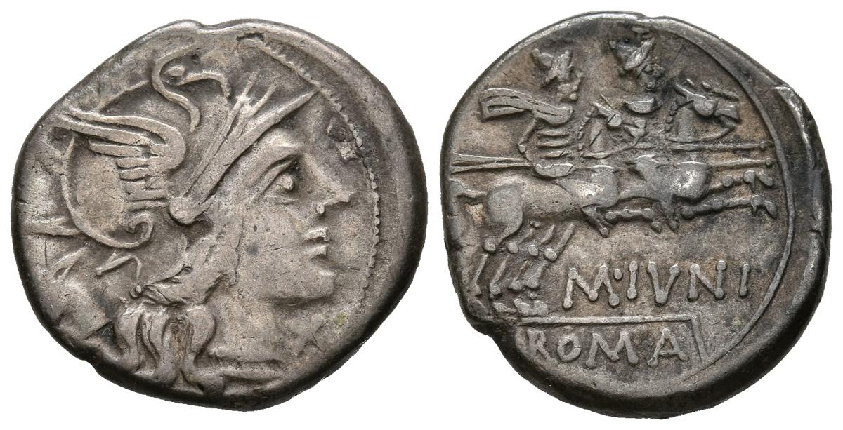 GENS JUNIA. Denario. (Ar. 3,97g/19mm). 145 a.C. Taller auxiliar de Roma. (FFC 778; Crawford 220/1). Anv: Cabeza de Roma a derecha, delante X, detrás cabeza de asno. Rev: Los Dioscuros a caballos a derecha, encima estrella, debajo leyenda: M IVNI, en exergo: ROMA. MBC.